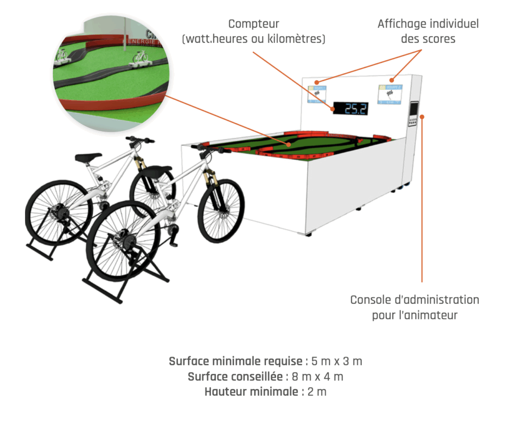 • 8 vélos générateurs (enfant / adulte) sur plancher bois (4 équipes de 2)