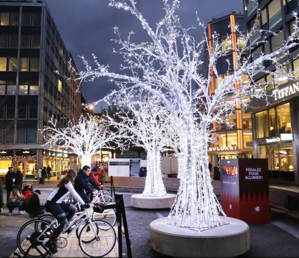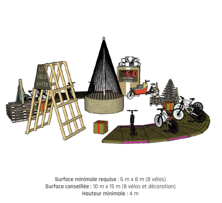 Nous installons un sapin une structure entièrement recouverte de rubans delumière. Pour les alimenter, nous mettons à disposition de 2 à 20 vélosgénérateurs en fonction de la taille du sapin et des quantités de lumières. Lesvisiteurs pédalent et déclenchent les lumières selon des scénarios personnalisés.Un compteur LED affiche l’énergie cumulée sur la durée de l’installatio