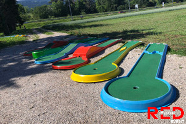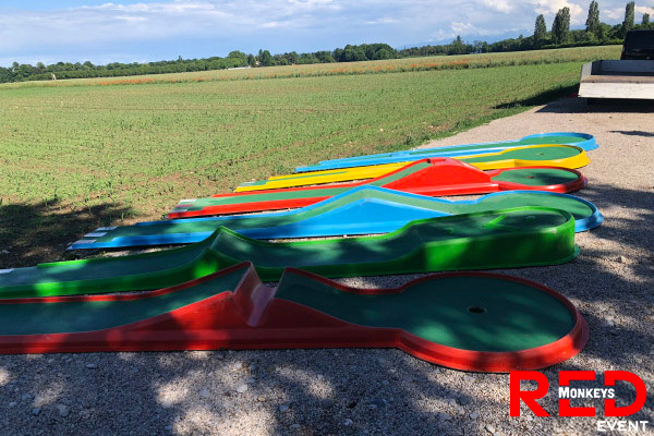 Offrez à vos invités une expérience de mini-golf unique avec notre parcours modulable mobile! Composé de jusqu’à 12 pistes avec des obstacles variés, il est parfait pour les événements en plein air, fêtes d’entreprise et activités familiales. De quoi divertir petits et grands, dans une ambiance conviviale et sportive!